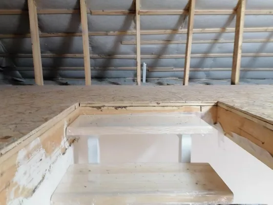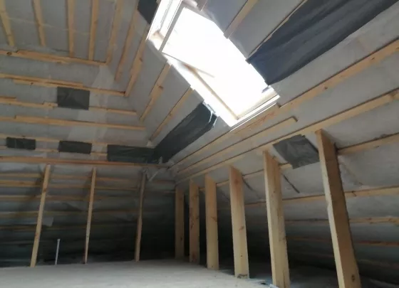Дом с мансардным этажом, мансарда свободной планировки утеплена , на мансарде сделан пол, уложена доска и плита OSB, есть окошко.