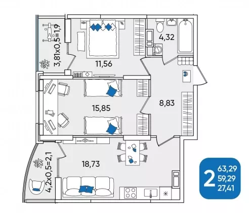 Продается 2-х комн. квартира, 63.29 кв.м., 24/24 эт