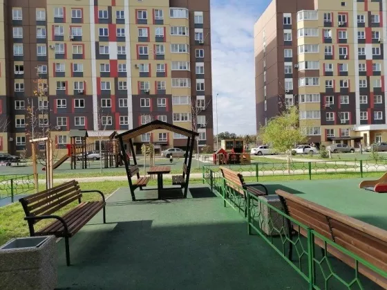 Большое расстояние между домами, много места для парковки автомобилей. Двор с красочными детскими и спортивными площадками , скамейками для отдыха и зелеными кустарниками и деревьями. Здесь хочется жить приезжайте и убедитесь сами.