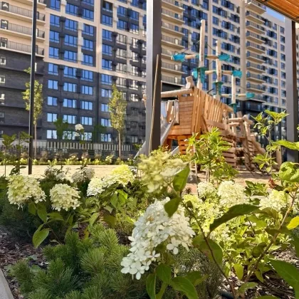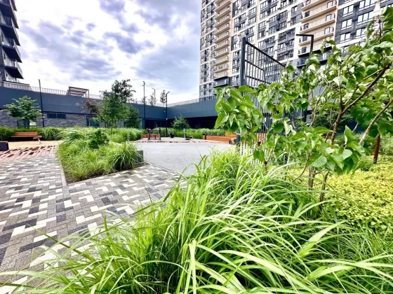 Ландшафтный дизайн всего комплекса, современные детские площадки с тематическими Арт-объектами и фонтаном, прогулочные зоны, футбольная и волейбольные площадки.