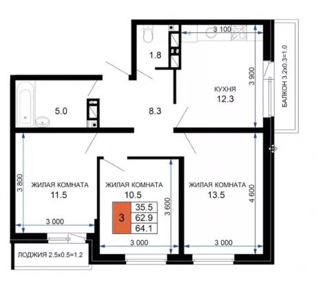Продается 3-х комн. квартира, 64 кв.м., 12/16 эт