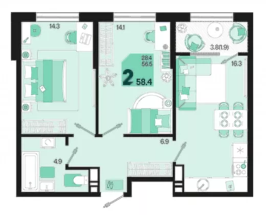 Продается 2-х комн. новостройка, 58.4 кв.м., 11/18 эт