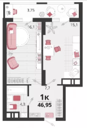 Продается однокомнатная новостройка, 46.95 кв.м., 8/18 эт
