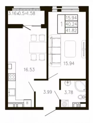 Продается однокомнатная новостройка, 41.82 кв.м., 3/9 эт