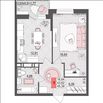 Продается однокомнатная новостройка, 42 кв.м., 7/19 эт