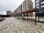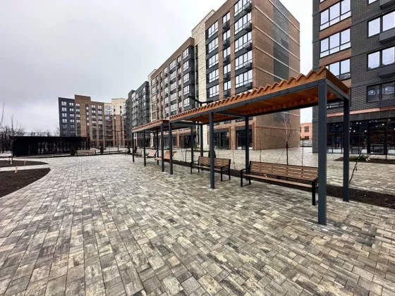 Прогулочные аллеи, велодорожка, игровые площадки для детей, места для отдыха взрослых, спортивные площадки, магазины, места для парковки велосипедов, колясок и самокатов.