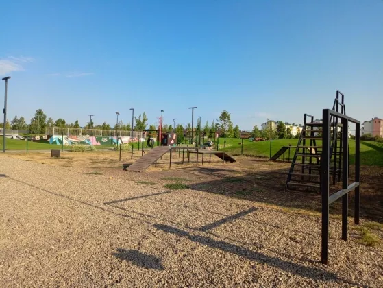 Большой парк 9 ГА: прогулочные аллеи и вело- дорожки, комфортные шезлонги, фонтан, амфитеатр для мероприятий, детский игровой городок, фудхолл и ресторанная галерея, зона для йоги, световые качели,скейт парк, кинофестивальная площадка, зона воркаут и баскетбольное дерево, комнаты матери и ребёнка, туалет, пункты охраны, фудтраки, площадка для выгула и дрессировки собак, арт-объекты.