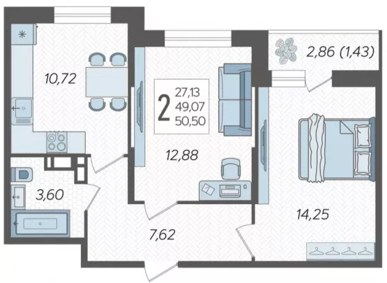 Продается 2-х комн. новостройка, 50.5 кв.м., 16/16 эт