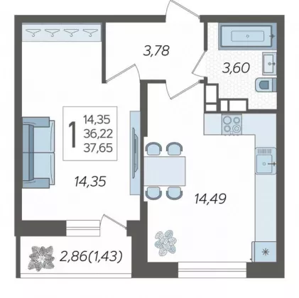 Продается однокомнатная новостройка, 37.65 кв.м., 14/19 эт