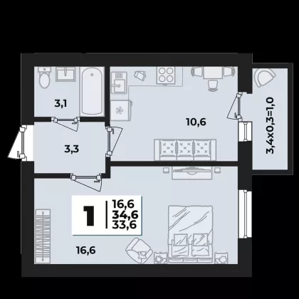 Продается однокомнатная новостройка, 34.6 кв.м., 4/5 эт