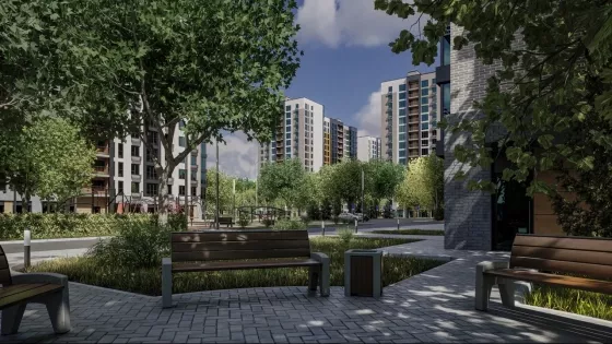 В жилом комплексе своя особая внутренняя среда, прогулочные аллеи с фонтаном, уютные зеленые дворы со скамейками, игровые и спортивные площадки с безопасным покрытием!