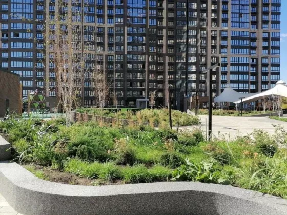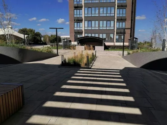 Во дворе-стилобат: 1 уровень - крытый наземный паркинг, а 2 уровень - зоны отдыха и развлечений с детскими и спортивными площадками, с зоной барбекю с беседками со столиками и лавками.