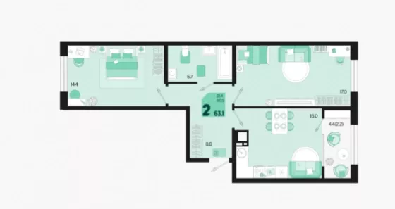 Продается 2-х комн. новостройка, 63.1 кв.м., 15/18 эт