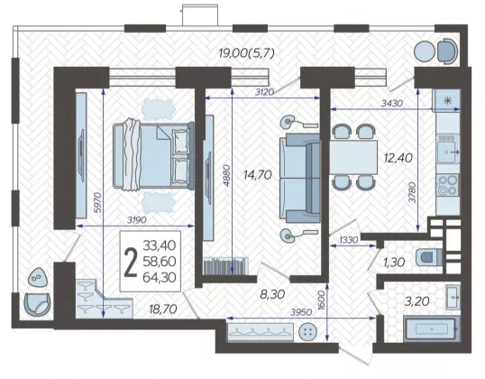 Продается 2-х комн. новостройка, 65.83 кв.м., 2/12 эт
