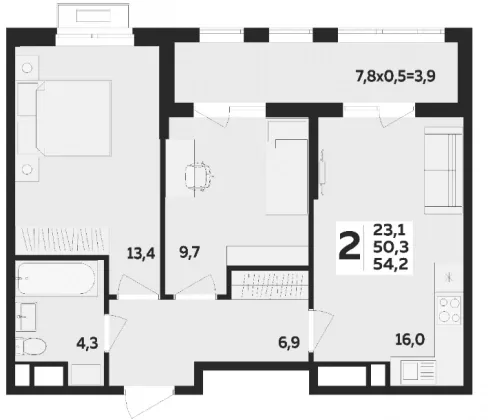 Продается 2-х комн. новостройка, 54.2 кв.м., 12/16 эт