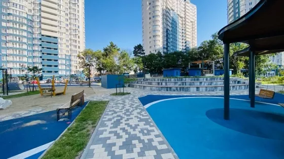 • ЖК расположен в Центральном окpугe г. Краснодар на берегу p.Kубaнь.