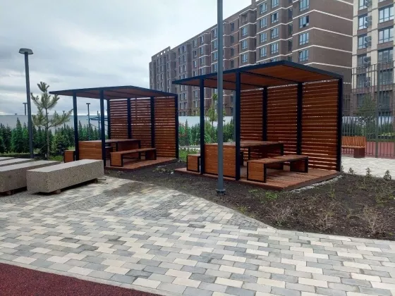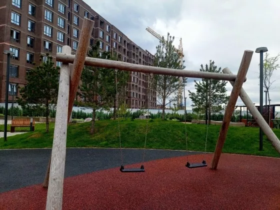 Закрытая территория с авторским ландшафтным дизайном, стильный фонтан, собственный хвойный парк, детские и спортивные площадки, зоны отдыха с беседками и шезлонгами оснащены зарядками, велодорожки и вело боксы.