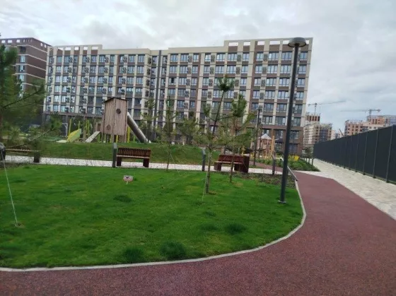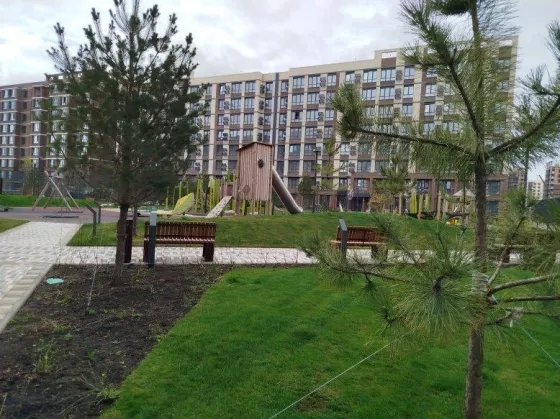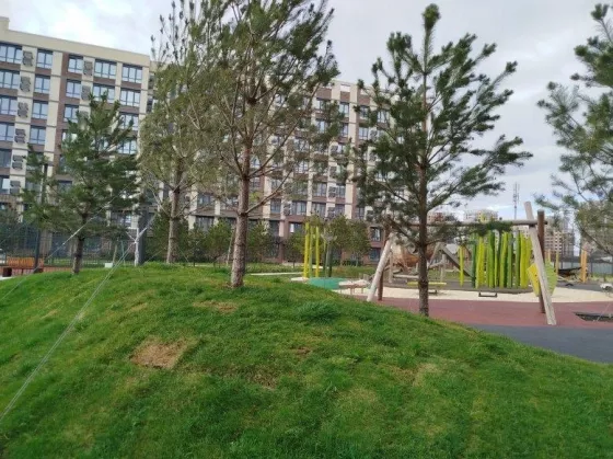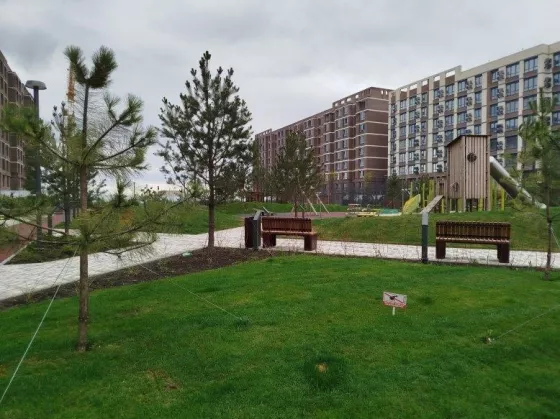 Панорамные окна, зеленные насаждения, парк из елей, цветники, ландшафтный дизайн двора, площадь парковых и прогулочных зон 2,2 гектара. В центре двора стильный фонтан, здесь же удобная зона с лежаками.