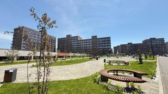 Уютные беседки,  современные детские и спортивные площадки на стилобате, автоматические поливы газонов, аллеи для прогулок, широкие дворы.