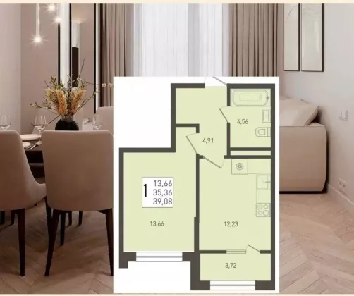 Продается однокомнатная новостройка, 39.08 кв.м., 5/8 эт