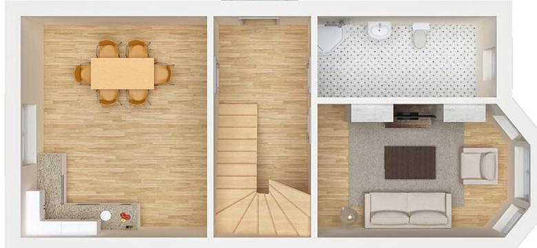 Первый этаж:  светлая кухня-гостинная 30 м2, просторный  холл12 м2, уютный зал 17 м 2 и большой санузел 9 м2