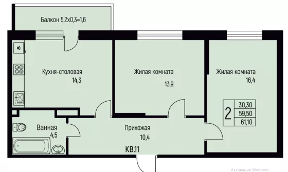 Продается 2-х комн. квартира, 61.1 кв.м., 3/3 эт