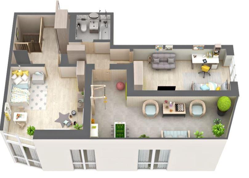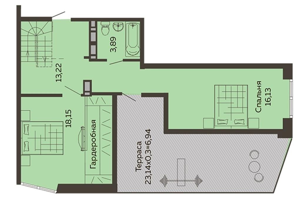 Трёхкомнатная квартира в двухуровнях, верхний этаж с большой открытой террасой. Три спальни и большая кухня гостиная 36 метров квадратных.