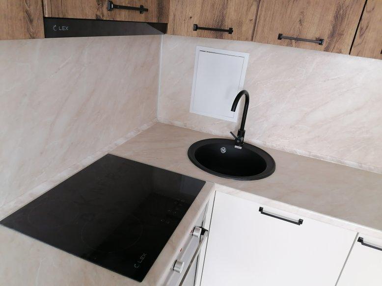 На кухне установлен кухонный гарнитур со всей необходимой техникой: варочная поверхность, духовой шкаф, вытяжка всё новое и добротное. Хороший смеситель и стильная раковина, на мебели дорогая фурнитура. Сан/узел - с сантехникой, балкон остеклен.