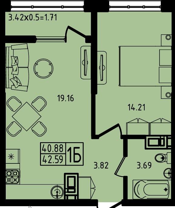 Продается однокомнатная квартира, 42.59 кв.м., 1/7 эт