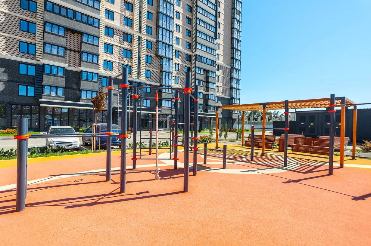 Современный благоустроенный двор. Витражное остекление, крепления под сплит-системы. Закрытый двор с лаунж-зонами и амфитеатром. Свои детский сад и школа прямо во дворе. Подземный паркинг.