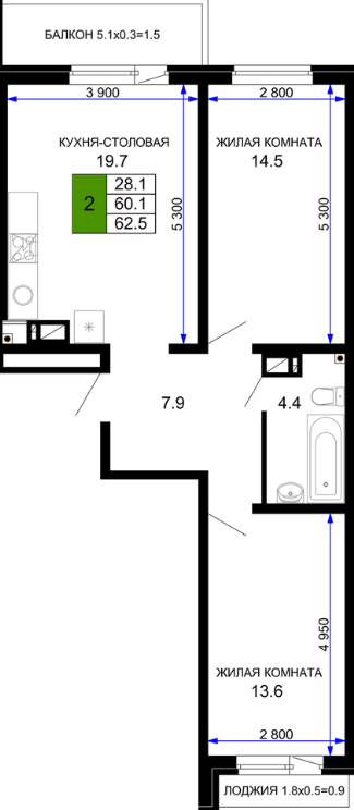 Продается 2-х комн. квартира, 62.5 кв.м., 14/22 эт