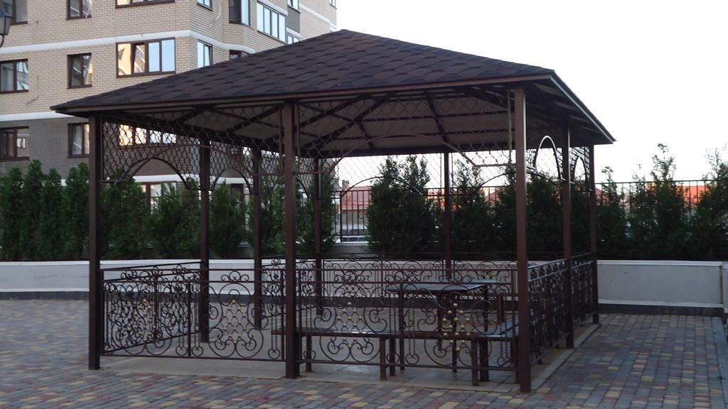 Велосипедная дорожка, фонтан, беседки и скамейки для отдыха.