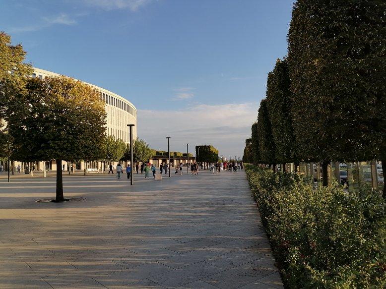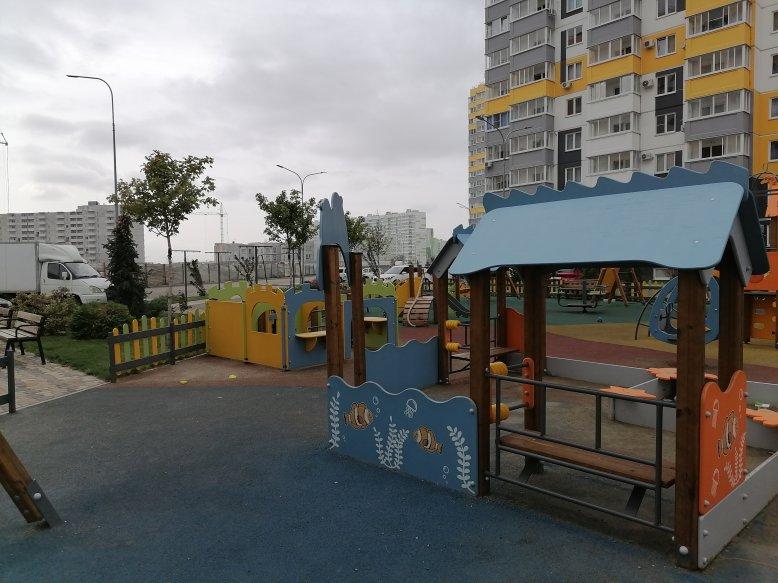 Большое расстояние между домами, много места для парковки автомобилей, также есть многоуровневая стоянка. Двор с красочными детскими и спортивными площадками, скамейками для отдыха и зелеными кустарниками и деревьями.
