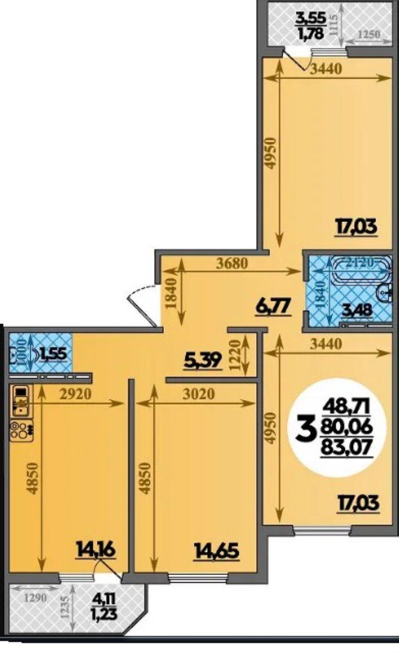 Продается 3-х комн. квартира, 83.07 кв.м., 4/16 эт