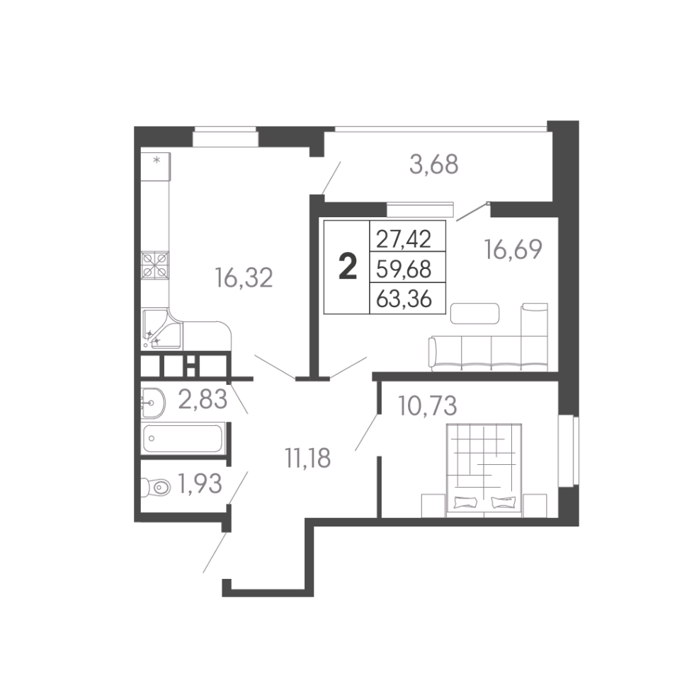 Продается 2-х комн. новостройка, 63.36 кв.м., 10/16 эт