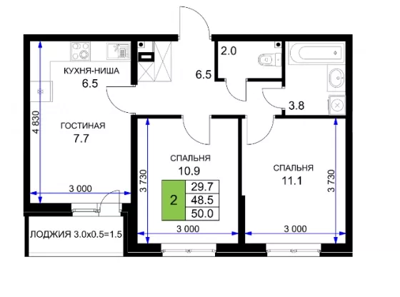 Продается 2-х комн. новостройка, 50 кв.м., 4/16 эт