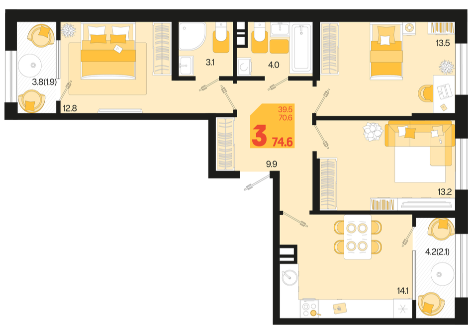 Продается 3-х комн. новостройка, 74.6 кв.м., 3/9 эт