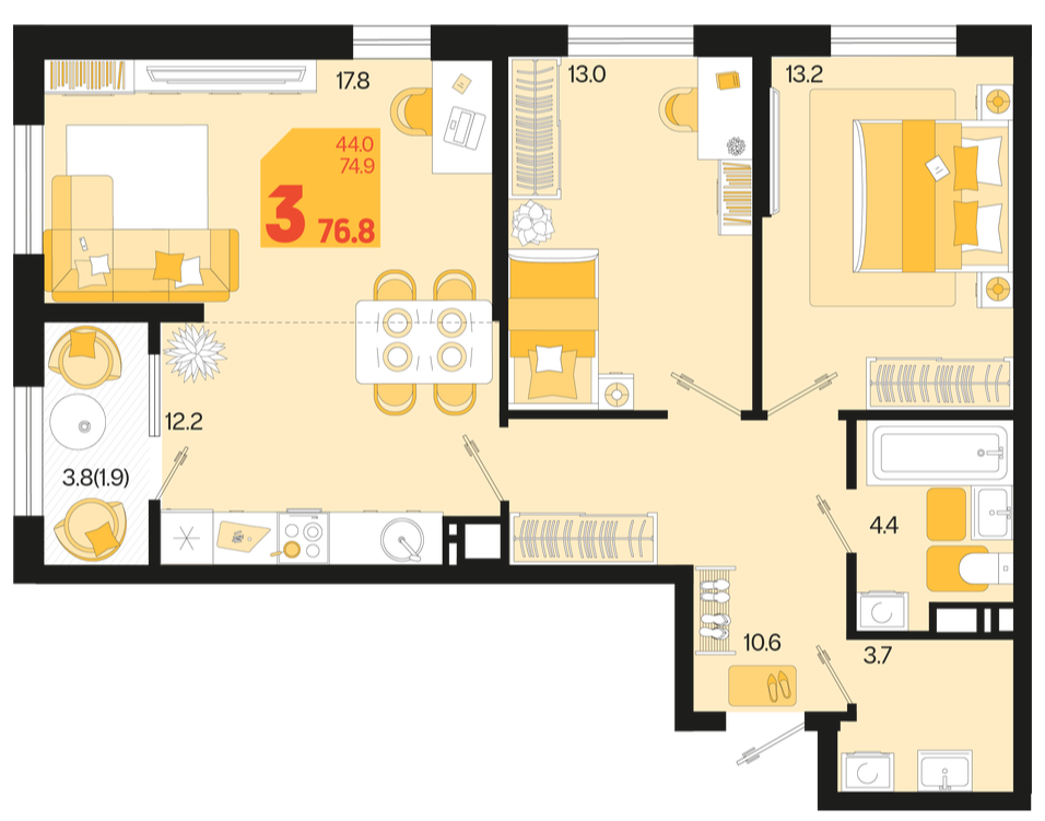 Продается 3-х комн. новостройка, 76.8 кв.м., 3/18 эт