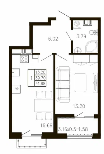Продается однокомнатная новостройка, 41.68 кв.м., 7/9 эт