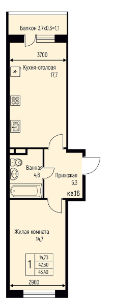 Продается однокомнатная новостройка, 43.4 кв.м., 1/3 эт