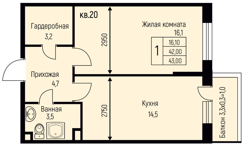 Продается однокомнатная новостройка, 43 кв.м., 1/3 эт