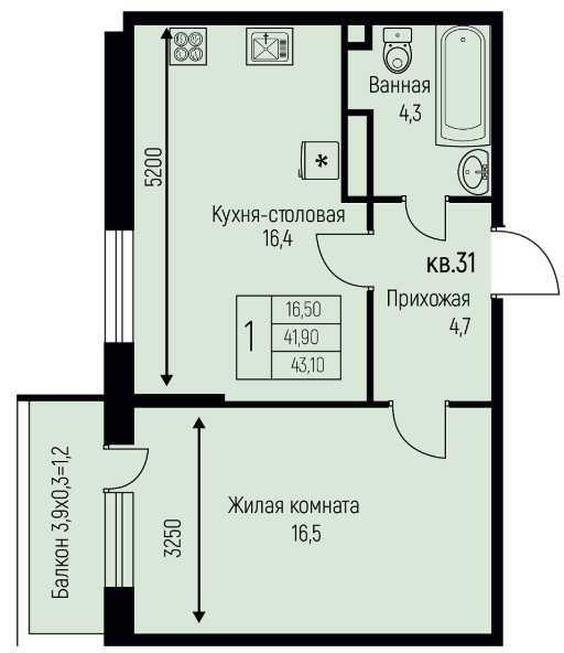 Продаётся 1 комнатная квартира с большой кухней- гостиной!