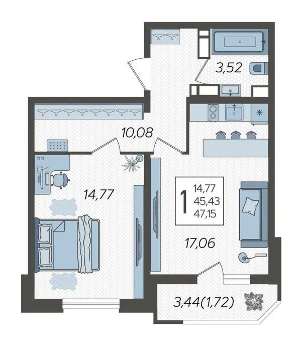 Продается однокомнатная новостройка, 47.15 кв.м., 23/23 эт