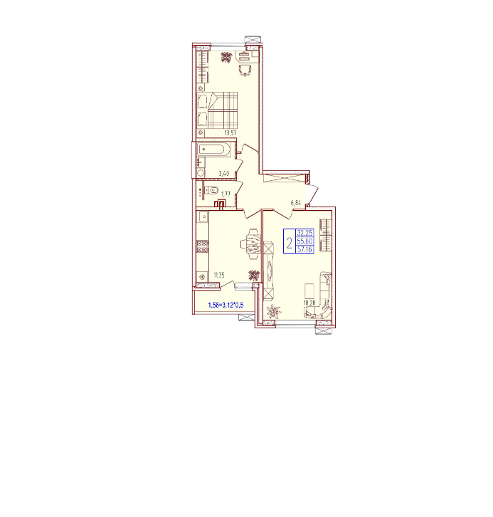Продается 2-х комн. новостройка, 57.16 кв.м., 1/17 эт
