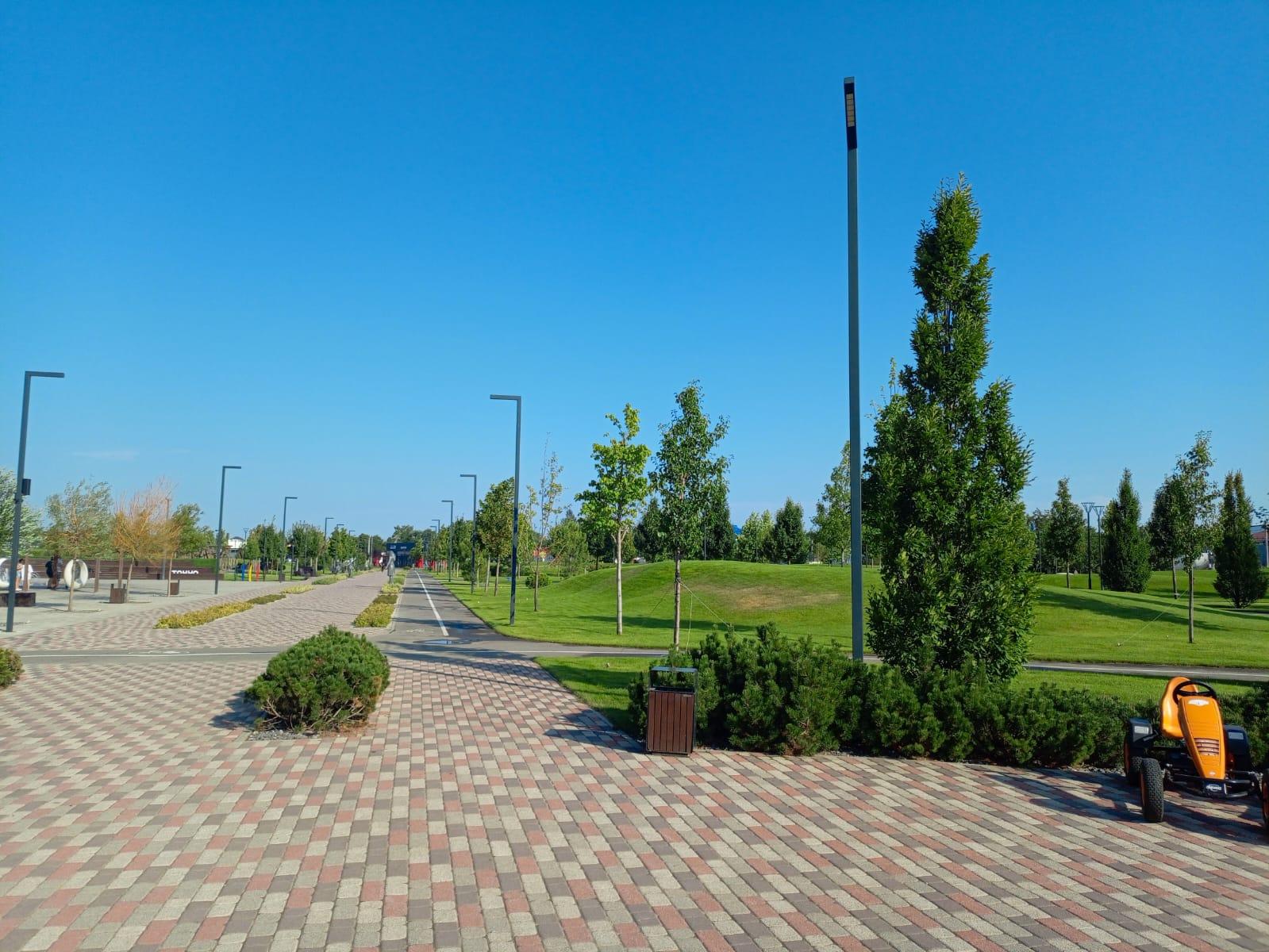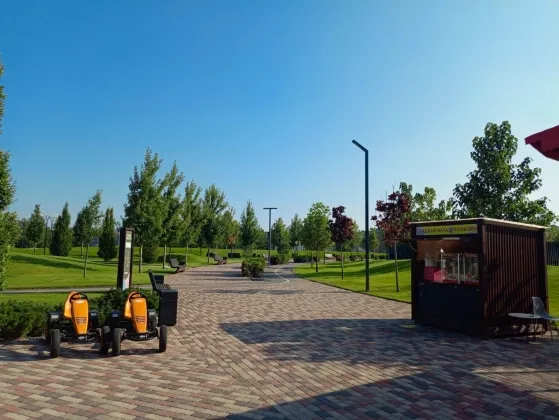 Большой парк: прогулочные аллеи и вело- дорожки, комфортные шезлонги, фонтан, амфитеатр для мероприятий, детский игровой городок, фудхолл и ресторанная галерея, зона для йоги, световые качели, скейтпарк, кинофестивальная площадка, зона воркаут и баскетбольное дерево, арт-объекты.