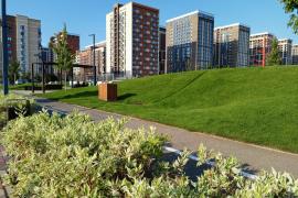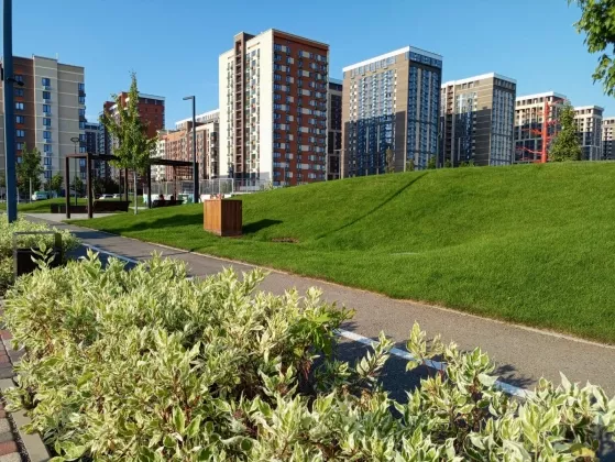 Большой парк: прогулочные аллеи и вело- дорожки, зона воркаут и баскетбольное дерево, скейтпарк, комфортные шезлонги, фонтан, амфитеатр для мероприятий, детский игровой городок, фудхолл и ресторанная галерея, зона для йоги, световые качели, кинофестивальная площадка, арт-объекты.