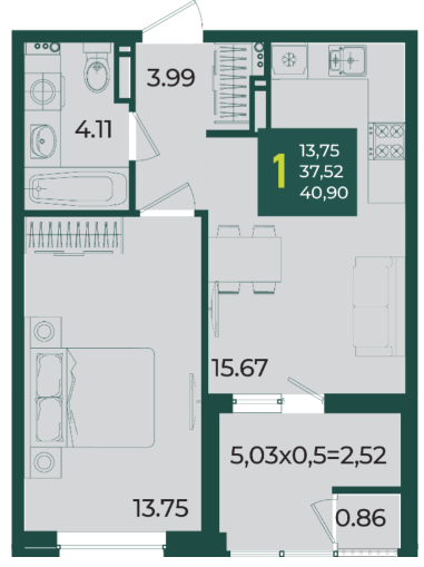 Продается однокомнатная новостройка, 40.9 кв.м., 18/18 эт
