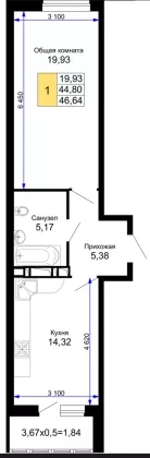 Продается однокомнатная новостройка, 46.64 кв.м., 9/15 эт
