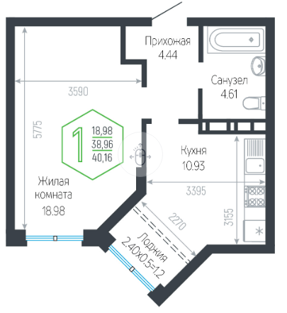 Продается однокомнатная новостройка, 40.16 кв.м., 13/16 эт