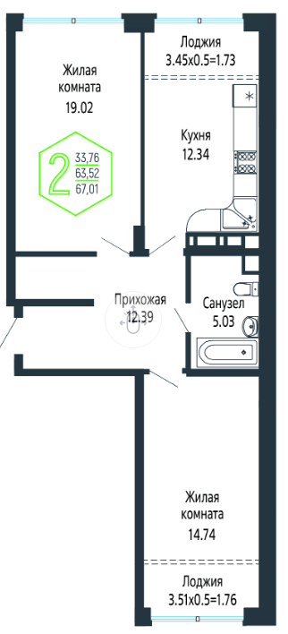 Продается 2-х комн. новостройка, 67.29 кв.м., 12/24 эт